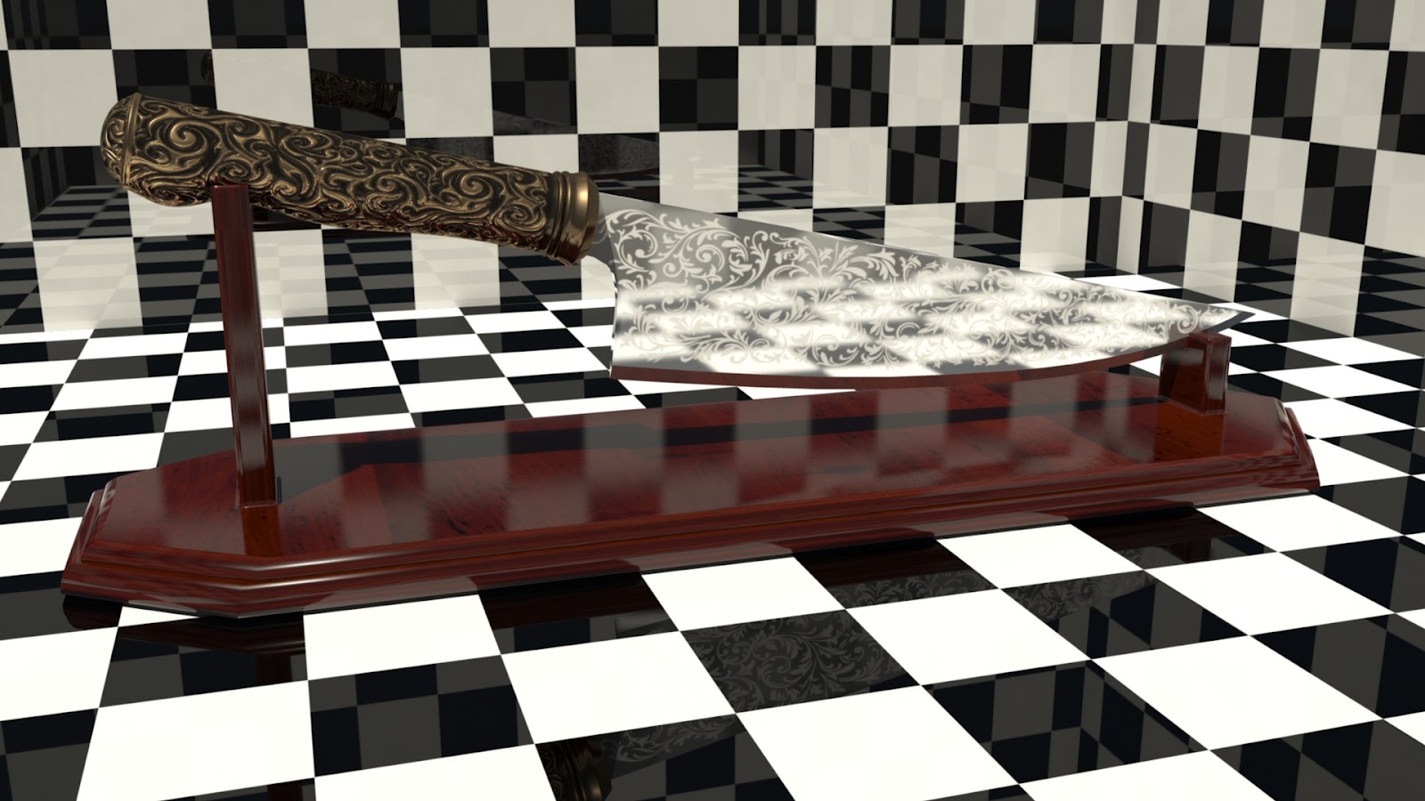 It has very intricate carving on the handle and etching on the blade, so it was a good demonstration of my skill with texture mapping in Maya, Photoshop, and Illustrator. The actual shape only took 3 or 4 hours to get right. The other ~20 hours was spent making the texture maps and doing the rendering. Now I know why there are less modelers in movie and game productions, and roughly double as many texture artists. The stand only took an hour or two. Rendering took 45 minutes per picture to render since I tried a new rendering technique.